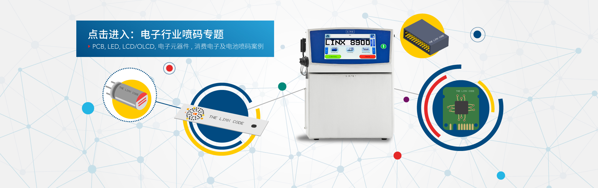 Linx連續噴墨噴碼機可為苛刻生產環境中的電子元器件提供可靠的產品標識碼。標碼高度低至 1.4 毫米 (CIJ) 和 0.8 毫米。